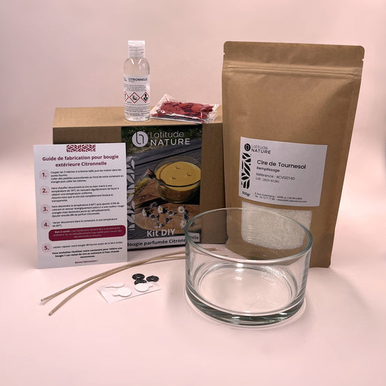 Chez Latitude Nature, nous vous proposons un Kit de fabrication de bougie à la citronnelle à base de cire de tournesol 100% végétale, sans OGM, biodégradable, il est idéal pour les adeptes du DIY (Do It Yourself).