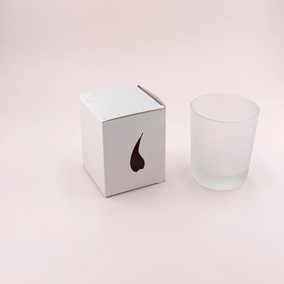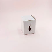 Boite en carton recyclé blanc pour bougies de 150 g avec découpe flamme.