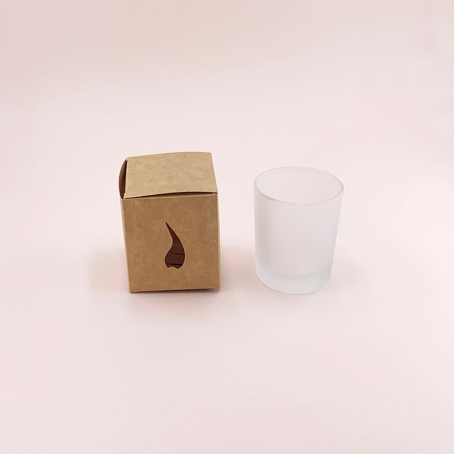 Boite pour bougie votive de 75 g en carton recyclé kraft avec découpe flamme.