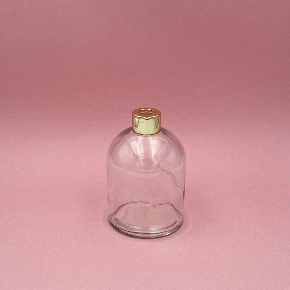 Diffuseur en forme de cloche en verre recyclable transparent fourni avec une bague or et un bouchon de protection.