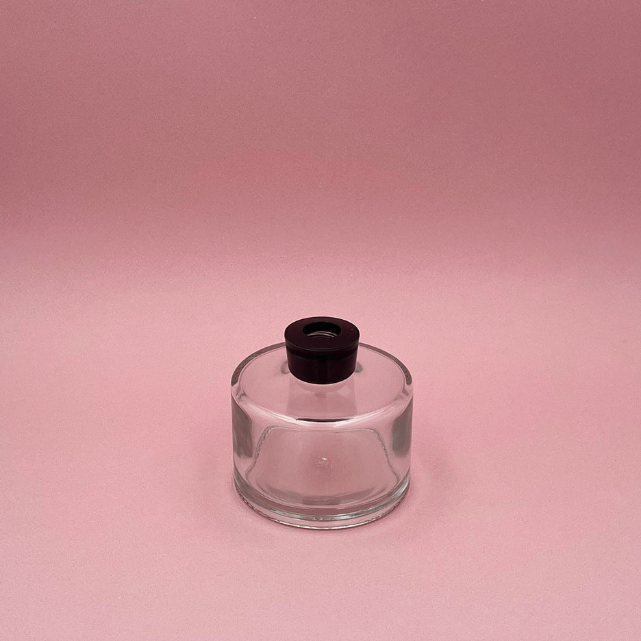 Diffuseur en forme de cylindre en verre recyclable transparent fourni avec une bague noire et un bouchon de protection.