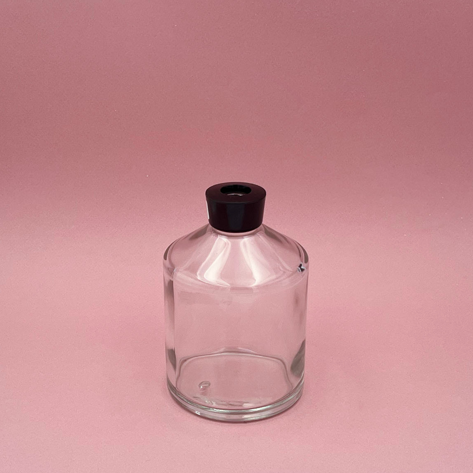 Diffuseur en forme de cylindre en verre recyclable transparent fourni avec une bague noire et un bouchon de protection.