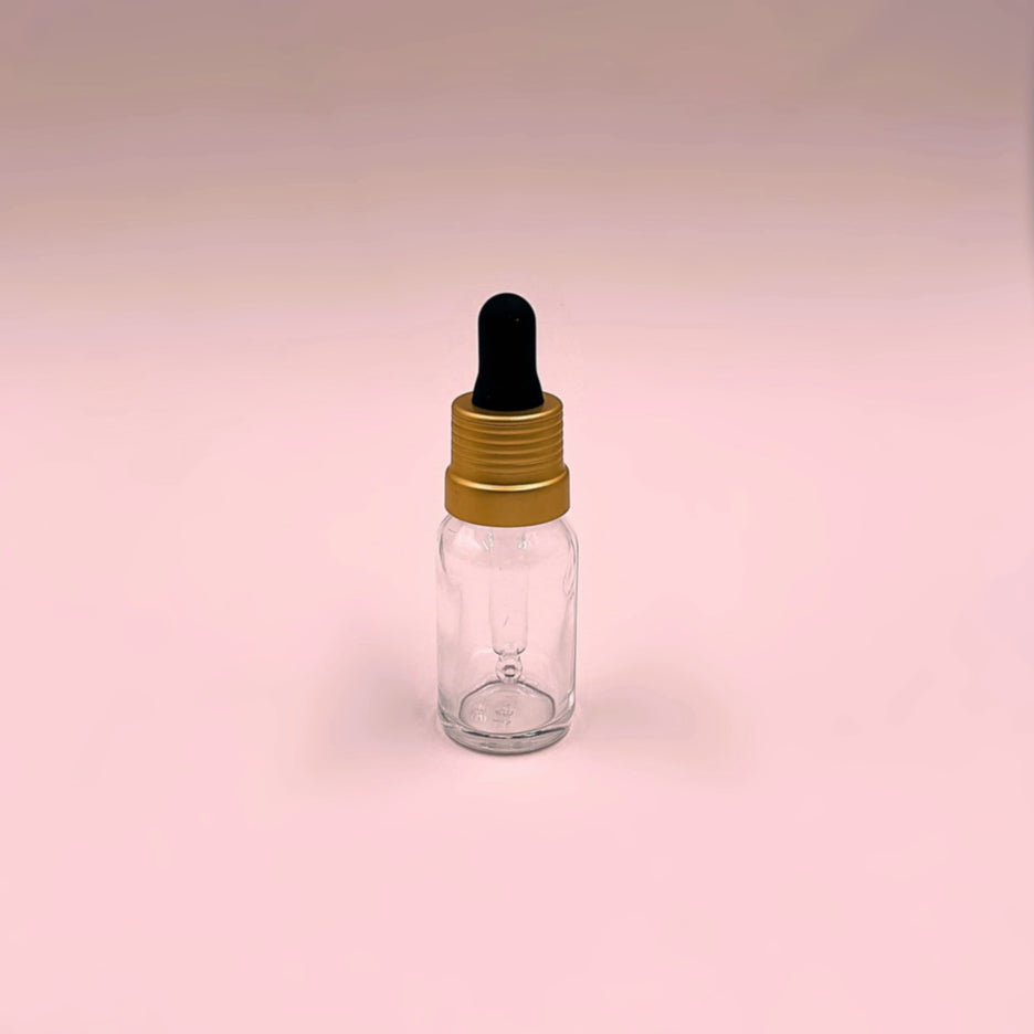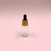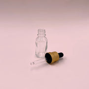Flacon transparent en verre avec pipette compte-gouttes noir et or.