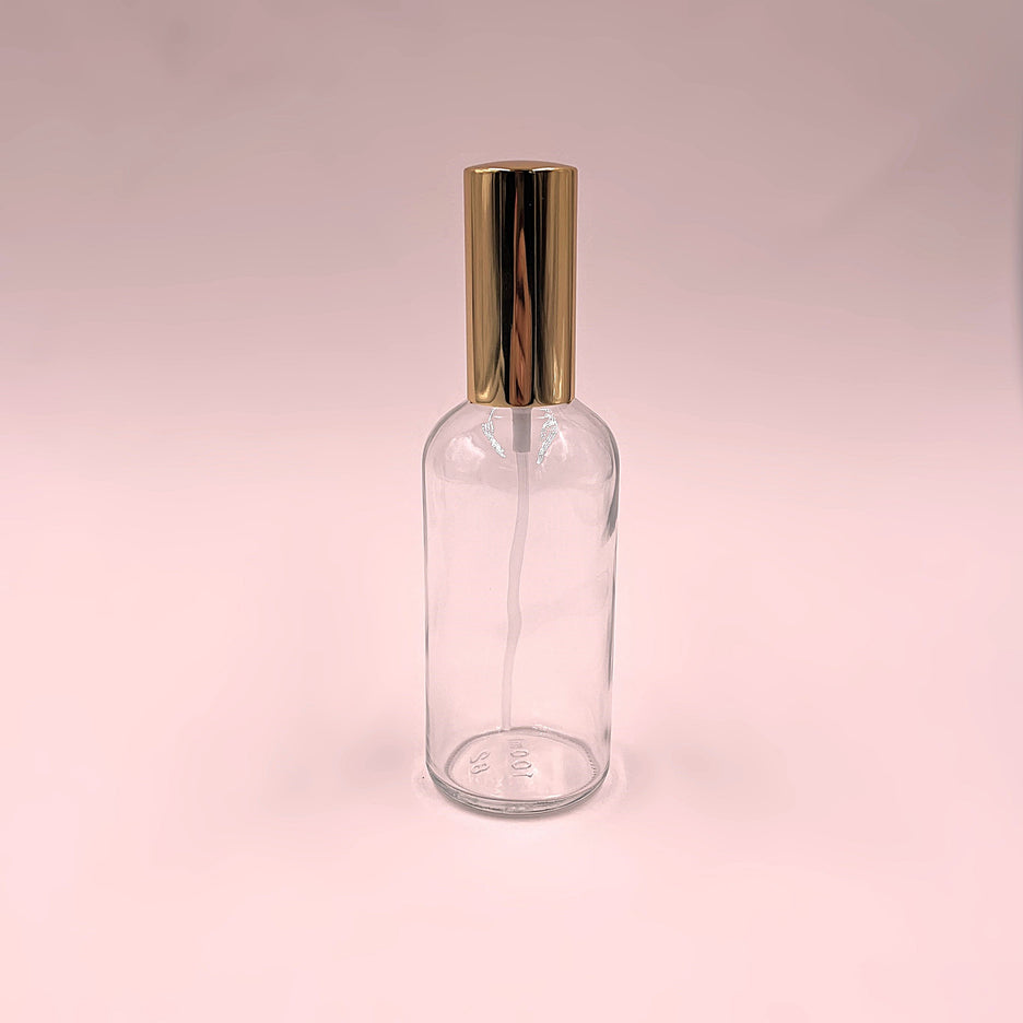 Flacon pulvérisateur transparent en verre avec pompe spray couleur or.