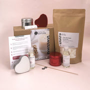 Ce kit complet DIY vous guide pas-à-pas pour fabriquer votre bougie coulée cœur. Il se compose de :