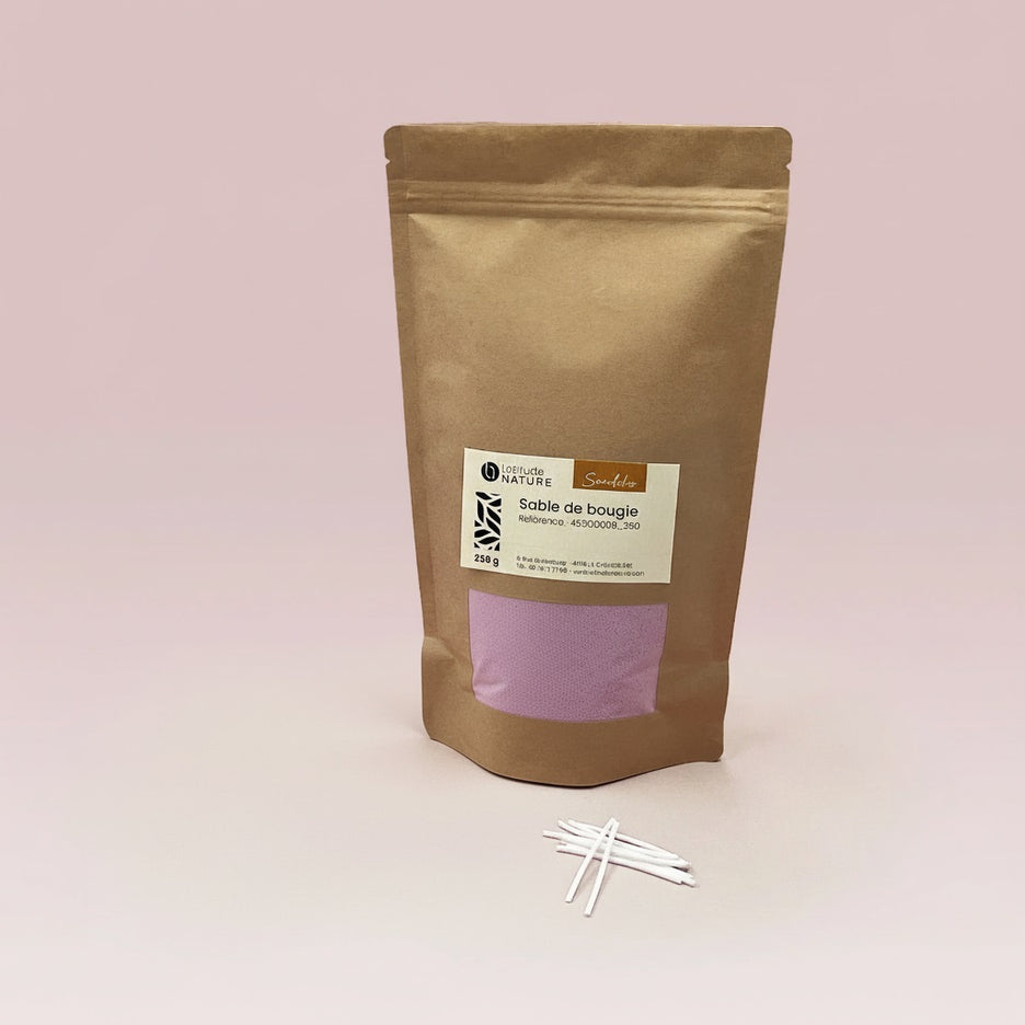 Inclus dans le sachet de 250 g de sable : 10 mèches plates 100% coton.